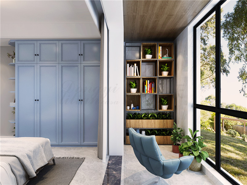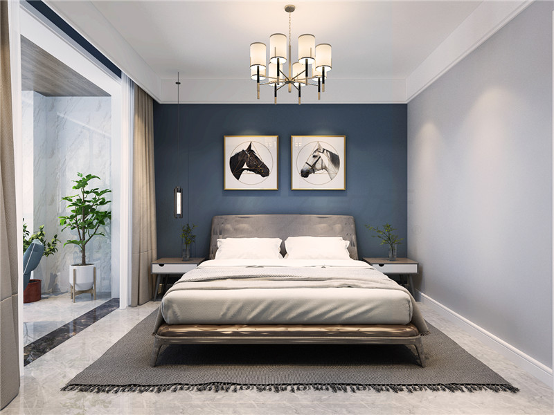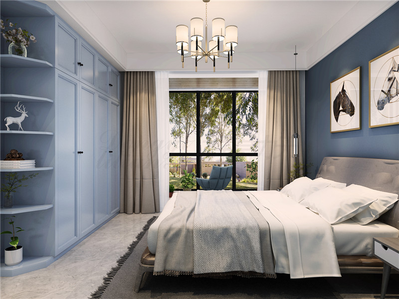 臥室:以沉靜的灰藍色素色墻面為核心,鄭州家裝公司利用大對比的撞色產生絕佳的視覺效果。