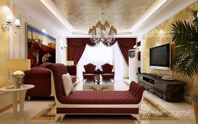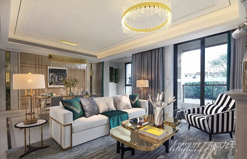 本案設計為美式簡約風格,鄭州裝修公司整個空間在色彩運用上以黃色為中心色;在材料上運用一些金色金屬材質邊框、鏡面、金屬飾品等現代材質,表現現代的一種生活方式;...