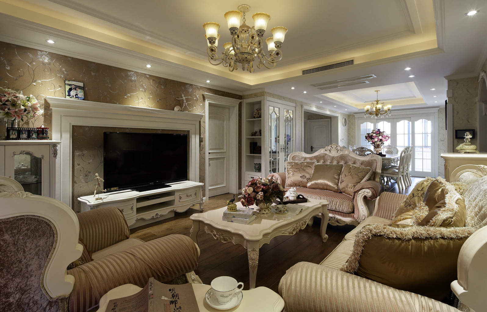 鄭州裝修公司設計案例,148平古典美式風格,客廳以深咖啡色為基調,咖啡色的壁紙、銀色的花紋、經典的美式家具,都透著美式的溫馨,電視墻壁爐設計對稱造型,立體感十足,以白...