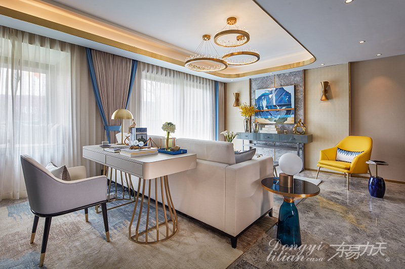 整個客廳空間非常大,設計師根據客戶需求,取中軸線一分為二,將開放式空間設計成客廳、書房兩個空間。鄭州裝飾公司|現(xiàn)代輕奢,要的就是這樣的精致范...